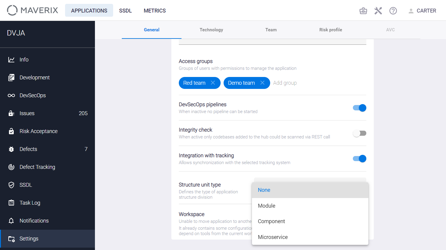 Select the Settings menu item on the left of the application page and go to the General tab. The current application structure unit type is shown in the Structure unit type section.