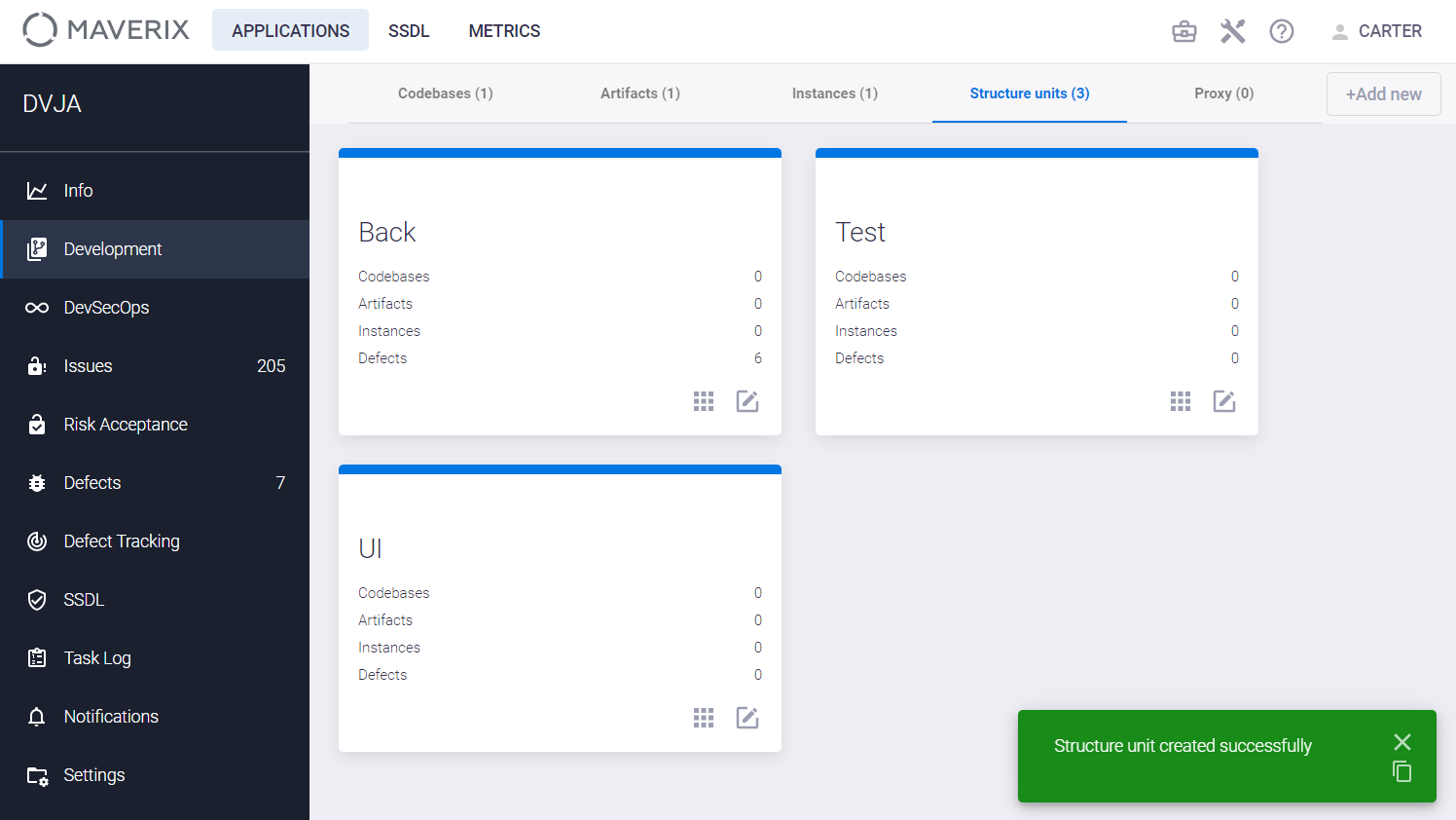 Each of these structural units has its own codebases, artifacts, instances, and defects. Each structure unit card shows a number of these items. Click the Edit unit